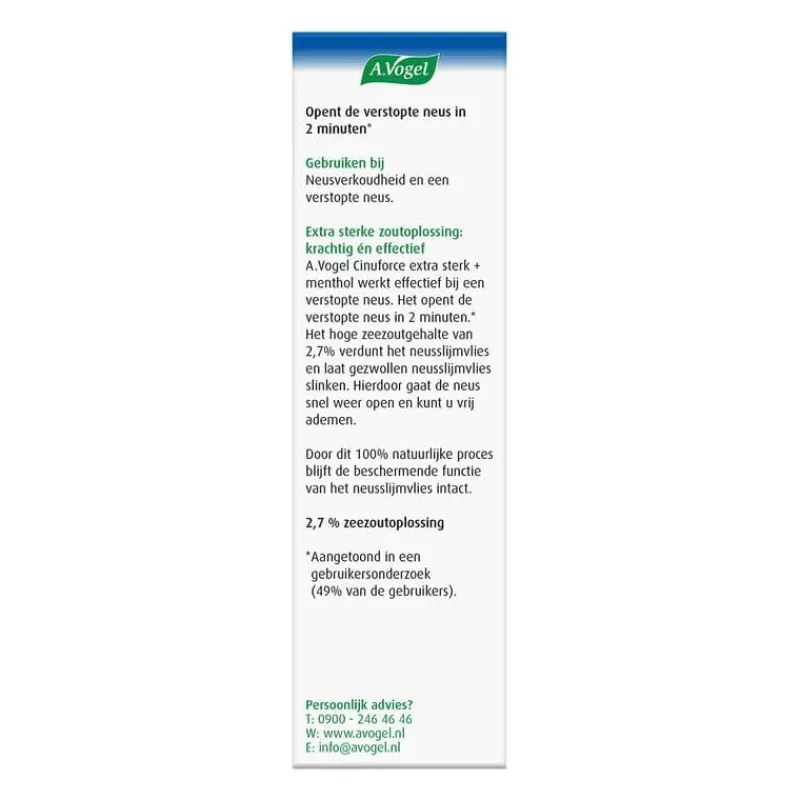Bij neusverkoudheid en een verstopte neus werkt Cinuforce neusspray extra sterk + menthol + eucalyptus krachtig en snel. Het hoge zeezoutgehalte van 2,7% verdunt het neusslijm en laat gezwollen neusslijmvlies slinken.