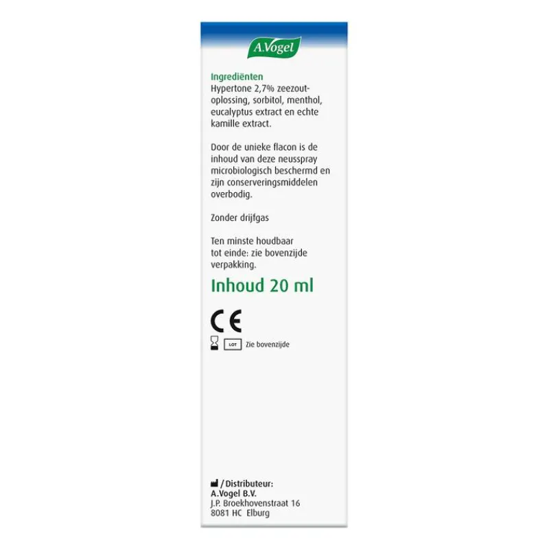 Hypertone 2,7% zeezoutoplossing, sorbitol, menthol, eucalyptus extract en echte kamille extract.