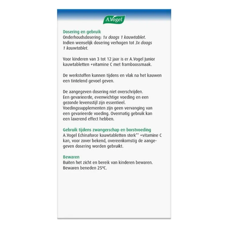 Een goede weerstand is belangrijk voor het behoud van een goede gezondheid. Je lichaam wordt dagelijks blootgesteld aan talloze invloeden van buitenaf en in sommige periodes is het goed je weerstand te ondersteunen met A.Vogel Echinaforce kauwtabletten sterk** + vitamine C.