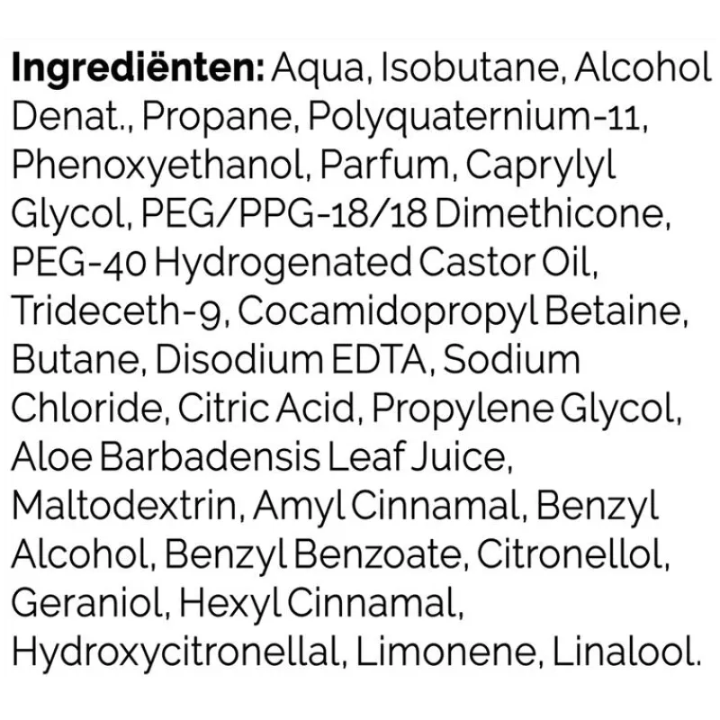 Aqua, Isobutane, Alcohol Denat., Propane, Polyquaternium-11, Phenoxyethanol, Parfum, Caprylyl Glycol, PEG/PPG-18/18 Dimethicone, PEG-40 Hydrogenated Castor Oil, Trideceth-9, Cocamidopropyl Betaine, Butane, Disodium EDTA, Sodium Chloride, Citric Acid, Propylene Glycol, Aloe Barbadensis Leaf Juice, Maltodextrin, Amyl Cinnamal, Benzyl Alcohol, Benzyl Benzoate, Citronellol, Geraniol, Hexyl Cinnamal, Hydroxycitronellal, Limonene, Linalool.