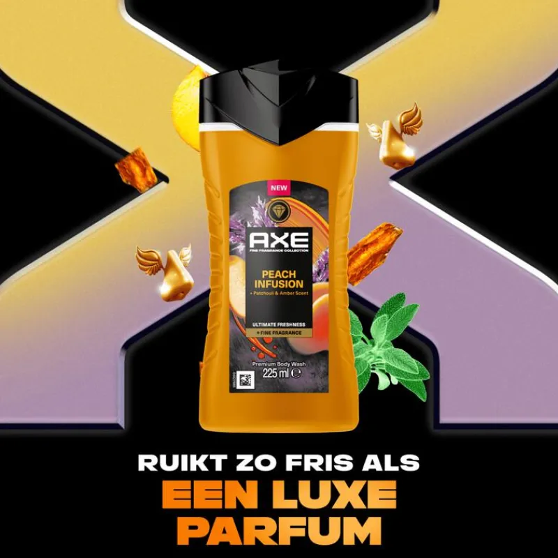 AXE Fine Fragrance Collection Peach Infusion Douchegel met de geur van patchoeli en amber ruikt als een luxe parfum en houdt je 12 uur lang fris.