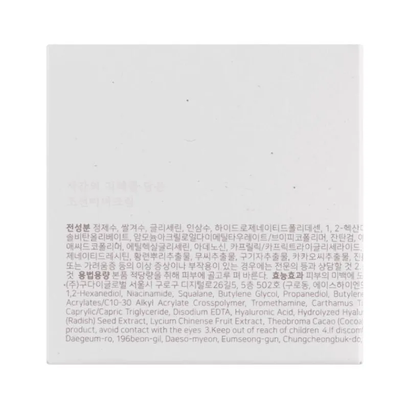 Water, Oryza sativa (rice) bran water, Glycerin, Panax ginseng root water, Hydrogenated polydecene, 1,2-Hexanediol, Niacinamide, Squalane, Butylene glycol, Propanediol, Butylene glyco. dicaprylate/Dicaprate, Cetearyl olivate, Sorbitan olivate, Ammonium acryloyldimethyltaurate/VP Copolymer, Xanthan gum, Acrylates/C10-30 alkyl acrylate crosspolymer, Tromethamine, Carthamus tinctorius (safflower) seed oil, Hydrogenated coconut oil, Glyceryl acrylate/acrylic acid copolymer, Ethylhexylglycerin, Adenosine, Caprylic/Capric triglyceride, Disodium EDTA, Hyaluronic acid, Hydrolyzed hyaluronic acid, Sodium hyaluronate, Honey extract, Ceramide NP, Hydrogenated lecithin, Coptis japonica root extract, Raphanus sativus (radish) seed extract, Lycium chinense fruit extract, Theobroma cacao (cocoa) seed extract, Phellinus linteus extract, Dextrin, Scutellaria baicalensis root extract