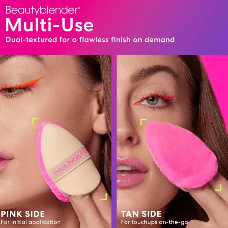 De beautyblender power pocket puff heeft twee kanten. De super zachte, roze zijde van de puff bevat speciale vezels die die ervoor zorgen dat je precies genoeg poeder aanbrengt. De nude kleurige, suede-achtige kan gebruik je om je poeder te bij te werken, alsof je het net hebt aangebracht! Door de handige vingerpocket heb je altijd perfecte grip. Pro tip: Rust je hand op de power pocket puff wanneer je iemand opmaakt, om uitvegen te voorkomen.