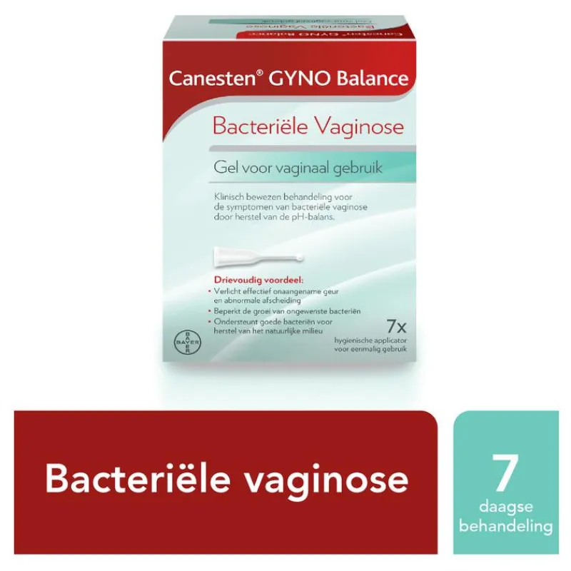 Bacteriële vaginose is de meest voorkomende vaginale infectie bij vrouwen in hun vruchtbare fase. Canesten Gyno Balance Gel is een klinisch bewezen meerdaagse effectieve bahandeling bij bacteriële vaginose. Het verlicht effectief de symptomen van bacteriële vaginose en verlicht zo de sterke, onaangename vaginale geur en ongewone afscheiding. Canesten, je voelt je snel weer jezelf.Symptomen en oorzaken Een bacteriële vaginose herken je aan symptomen zoals sterke vaginale geur (visachtige geur) en grijs witte waterige afscheiding. Een bacteriële vaginose ontstaat doordat de bacteriën die van nature voorkomen in je vaginale flora de overhand krijgen en sneller gaan groeien. De oorzaken hiervoor kunnen o.a. zijn: te veel en té grondig wassen met zeep, het gebruik van vaginale spoelingen of deoderant, menstruatie of zwangerschap, sperma, gebruik van antibiotica of andere medicatie. De symptomen van bacteriële vaginose behandel je effectief met een vaginale gel zoals Canesten Gyno Balance Gel. Breng de gel 7 dagen inwendig aan met de voorgevulde tubes met applicator, ter behandeling van de symptomen. Canesten Gyno Balance Gel is een fijne inwendige behandelvorm in het geval je liever een gel gebruikt dan een capsule. Ook tijdens je zwangerschap kun je, in overleg met je arts, Canesten Gyno Balance Gel gebruiken. Canesten Gyno Balance is een medisch hulpmiddel. Lees voor gebruik de gebruiksaanwijzing.