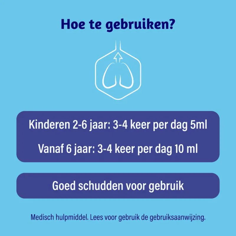 Dosering; * Kinderen van 2-6 jaar: 3-4 keer per dag 5ml * Vanaf 6 jaar en volwassenen: 3-4 keer per dag 10 ml. Goed schudden voor gebruik en lees voor gebruik de gebruiksaanwijzing.Te gebruiken voor kinderen vanaf 2 jaar onder toezicht van volwassenen. Alleen voor oraal gebruik. Niet gebruiken bij overgevoeligheid voor één van de ingrediënten. Niet geschikt voor diabetici. Raadpleeg voor gebruik eerst de huisarts tijdens zwangerschap en borstvoeding.