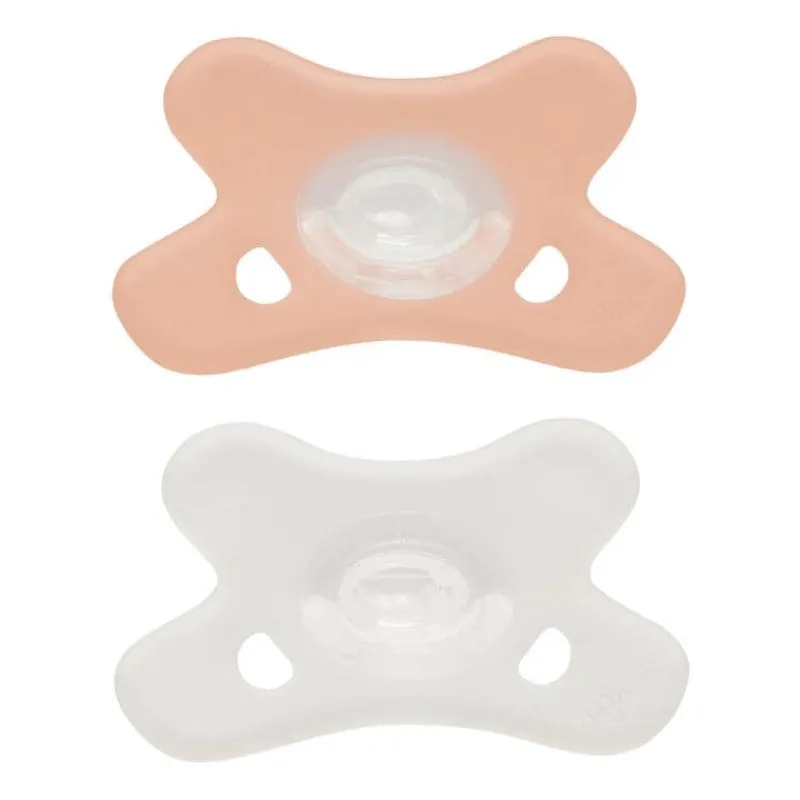 Het lichte schildje is voorzien van ventilatiegaatjes, zodat er voldoende lucht bij de huid kan komen. Dit helpt huidirritatie rond de mond voorkomen. De speen is symmetrisch, wat betekent dat hij altijd goed in het mondje ligt – hoe je kindje hem ook pakt.