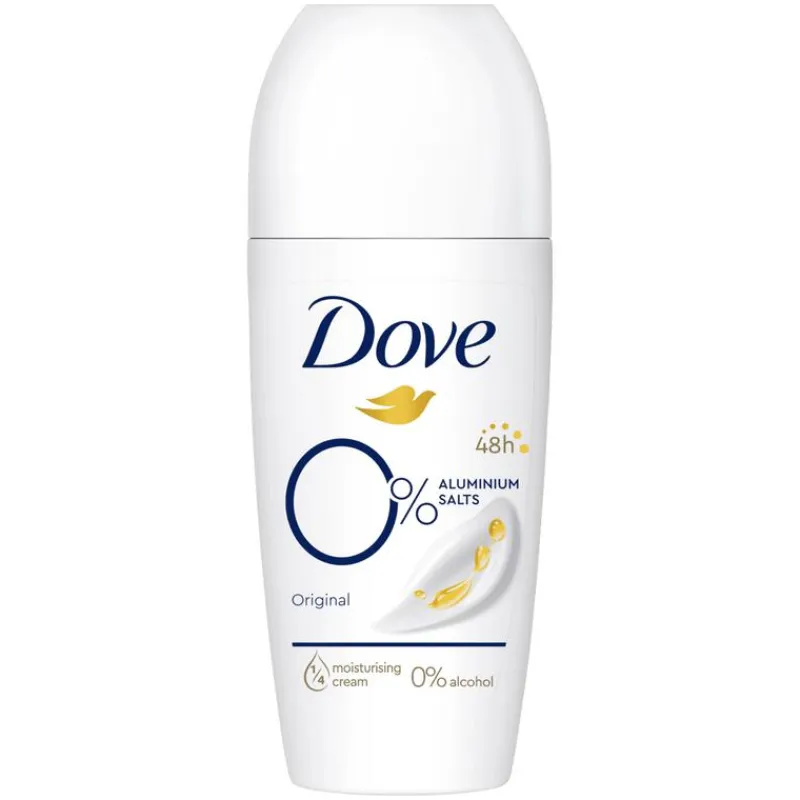 Dove Original 0% Deodorant Roller met 0% aluminiumzouten en 1/4 hydraterende crème, biedt tot 48 uur frisheid met de vertrouwde geur van Dove.