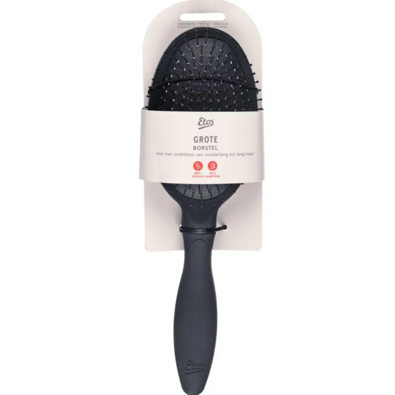 De Etos Grote Borstel is de ideale keuze voor dagelijks gebruik als je op zoek bent naar een borstel die je haar snel en effectief kan stylen. Deze ovale borstel is voorzien van stevige nylon pennen die soepel door je haar glijden, zonder het te beschadigen. Dankzij het grotere formaat is deze borstel perfect voor mensen met langer of dikker haar, en het helpt klitten eenvoudig te verwijderen.