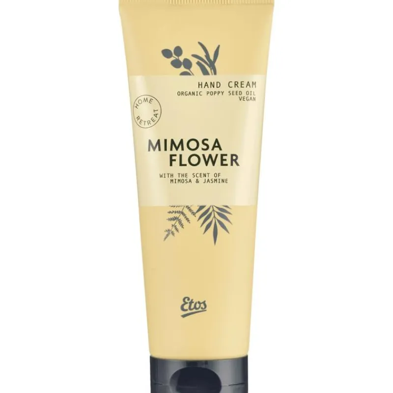 Etos Mimosa Flower Hand cream 75 ml verzorgt je handen en is verrijkt met organic klaprooszaadolie om te genieten van een wellness moment thuis. Deze handcrème maakt je handen lekker zacht en is licht geparfumeerd met de bloemige geur van mimosa en jasmijn.