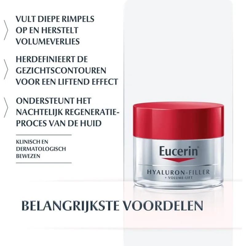 Eucerin Hyaluron-Filler + Volume-Lift combineert 3 actieve ingrediënten, die specifiek werken in de verschillende huidlagen: