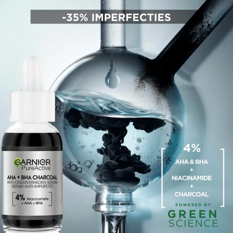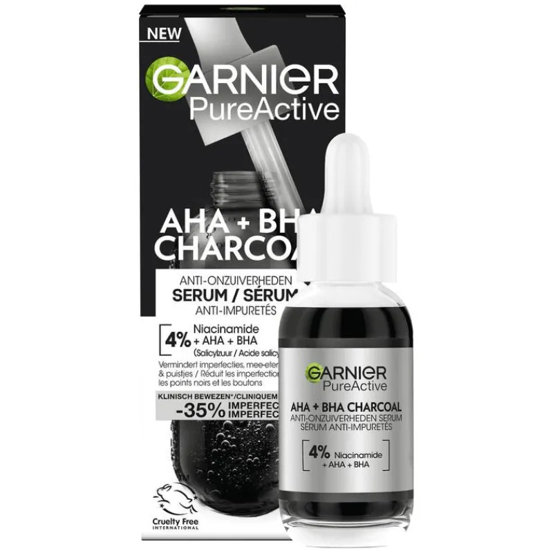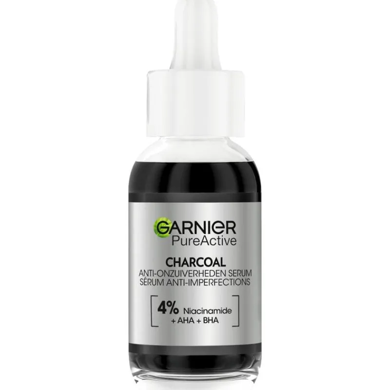 Garnier PureActive Anti-Onzuiverheden Serum met AHA + BHA & Charcoal is ons 1ste zwarte serum, geconcentreerd met 4% [NIACINAMIDE + AHA + BHA], vermindert puistjes en de zichtbaarheid van vlekjes en imperfecties. Het maakt de huid gladder en laat deze er egaler uitzien. AHA staat bekend om het exofoliëren van de doffe & oneffen huid, BHA helpt puisten & poriën te verminderen, en niacinamide staat bekend om een oncomfortabel gevoel bij puistjes te verzachten. Charcoal is een ingrediënt van natuurlijke oorsprong dat wel bekend is om haar zuiverende en matterende werking Ontdek ook de andere producten van Garnier PureActive voor een gladdere en gematteerde huid!