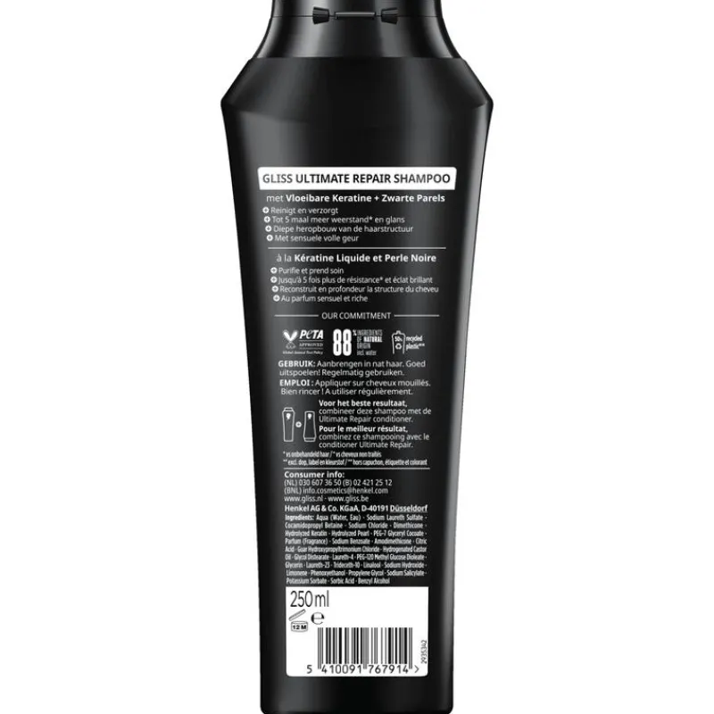 Sterk beschadigd haar verliest voortdurend keratine, wat resulteert in een ernstig verzwakte haarstructuur. Het heeft een intensieve verzorging nodig om dit keratineverlies aan te vullen en het haar zo te herstellen. Gliss Ultimate Repair haarverzorgingsshampoo combineert vloeibare keratine & zwarte parelextract om verloren keratine precies aan te vullen en de haarstructuur intensief te herstellen.