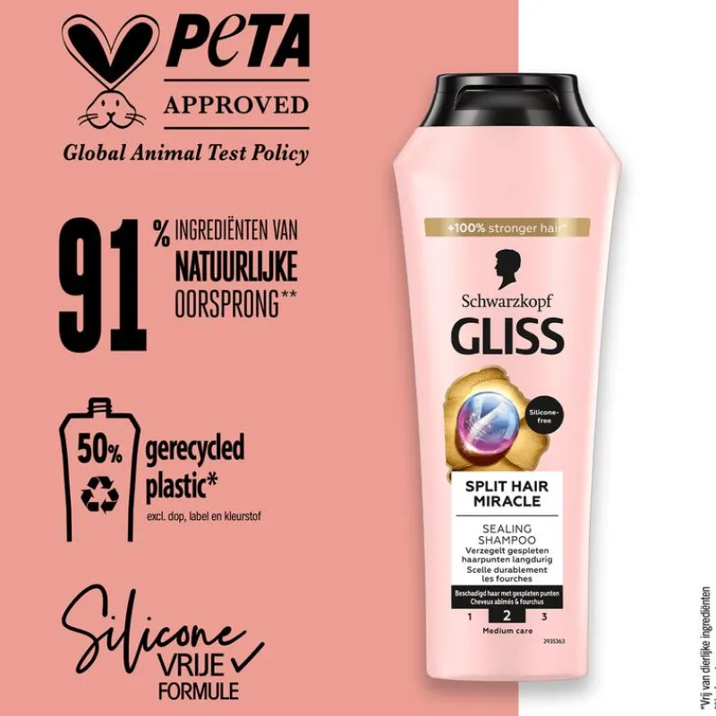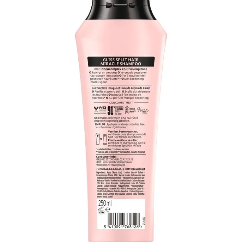 Heb je genoeg van gespleten haarpunten en pluizig haar? Verzegel gespleten haar langdurig! Deze Gliss Split Hair Miracle verzegelende shampoo combineert ionencomplex en druivenpitolie om beschadigde haarvezels en haarbreuk te herstellen.Gliss Care Level: 2 – Medium verzorging, met een uitgebalanceerde samenstelling van voedende ingrediënten.Deze Gliss shampoo werkt als een haarrits, met langdurige verzegeling voor tot 3 maal minder gespleten haarpunten (vs. onbehandeld haar). Deze verzegelende haarverzorgingsshampoo beschermt, versterkt en reinigt het haar voor een sterk en gezond haargevoel. Met een cocooning muskusgeur. De formule is siliconenvrij met 91% van de ingrediënten van natuurlijke oorsprong (inclusief water). Alle Gliss haarverzorgingsproducten zijn vegan (zonder ingrediënten van dierlijke oorsprong).