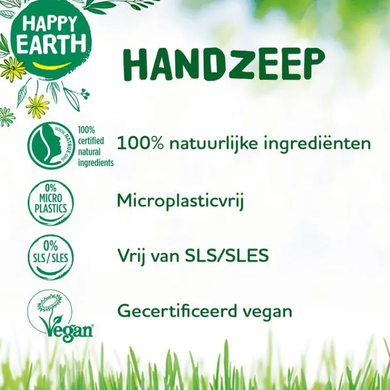 In HAPPY EARTH HAND SOAP gebruiken we alleen ingrediënten waar jouw huid blij van wordt. Als je iets op je huid aanbrengt en door het putje spoelt, is het fijn om te weten dat er geen vervuilende en vervelende ingrediënten in zitten zoals SLS/SLES, parabenen, kleurstoffen of andere nare toevoegingen. Daarom dragen wij met trots de keurmerken van NATRUE en Vegan Society. En onze handzeepflessen zijn gemaakt van 100% gerecycled plastic. Zo zorg je niet alleen goed voor jezelf maar ook voor onze aarde!