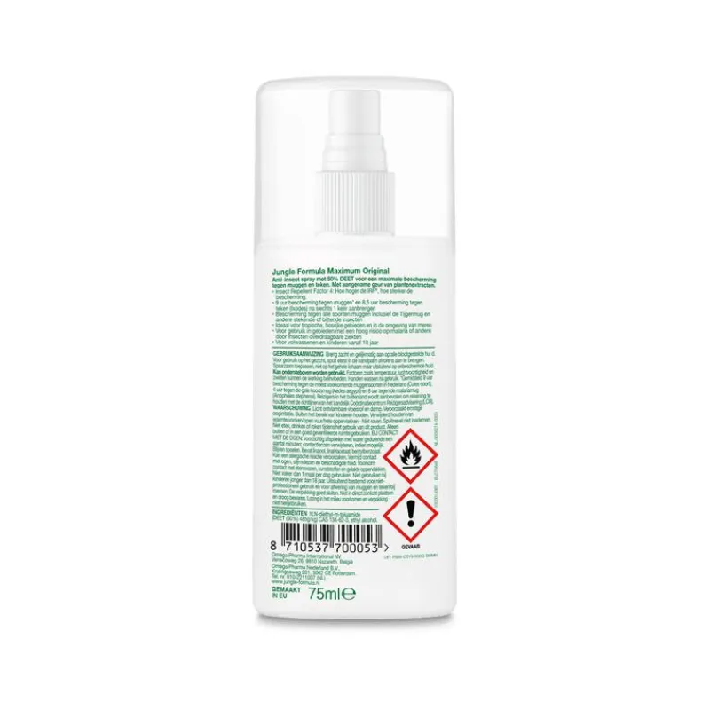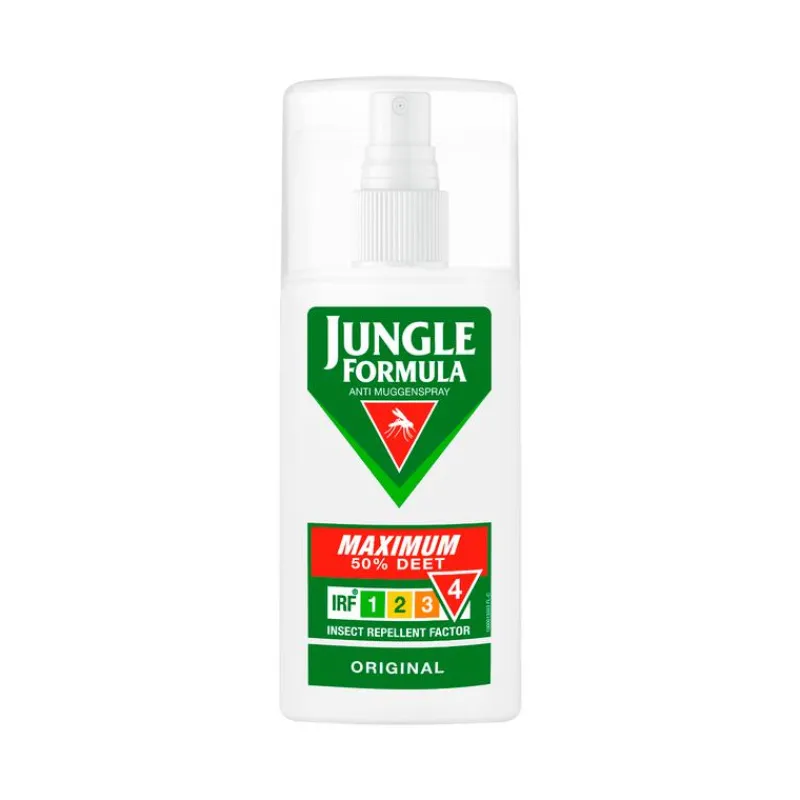 Jungle Formula Maximum Original is een antimuggen spray met 50% DEET en plantenextracten voor een sterke bescherming. Deze muggenspray heeft een aangename geur en geeft wel 9 uur bescherming tegen alle soorten muggen inclusief de Tijgermug en andere stekende of bijtende insecten. Ideaal voor gebruik binnen- en buitenshuis & voor vakanties in Europa.Deze muggenbescherming ideaal voor tropische, bosrijke gebieden en in de omgeving van meren. Voor gebruik in gebieden met een hoog risico op malaria of andere door insecten overdraagbare ziekten.Ideaal voor tropische, bosrijke gebieden en in de omgeving van meren.Alle producten van Jungle Formula bevatten een IRF®. Hoe hoger de IRF®, hoe sterker de bescherming. Jungle Formula is er in IRF2, IRF3 en IRF4 variante