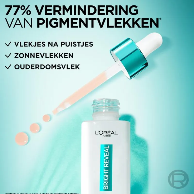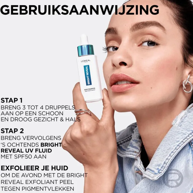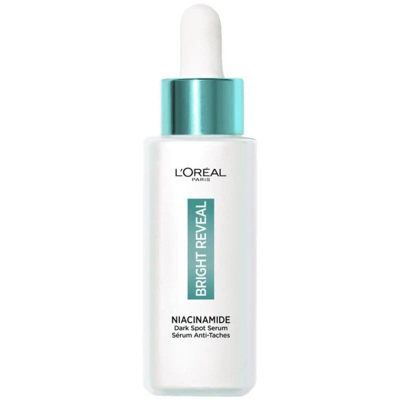 Laat jouw huid stralen met dit vernieuwende, krachtige serum!”,”L’Oréal Paris Bright Reveal Dark Spot serum is jouw geheim voor het verminderen van pigmentvlekken en een doffe huid. Al vanaf het eerste gebruik van dit geavanceerde serum merk je direct de klinisch bewezen doeltreffendheid tegen diverse soorten vlekken, zoals zonne- en pigmentvlekjes, ouderdomsvlekjes en zelfs vlekken die zijn ontstaan na puistjes of onzuiverheden. Voor zichtbare resultaten in slechts één week. De formule is verrijkt met hoogwaardige dermatologische ingrediënten en biedt een krachtige combinatie van niacinamide en 2,5% aminosulfonzuur. Laat jouw huid stralen met dit vernieuwende, krachtige serum!