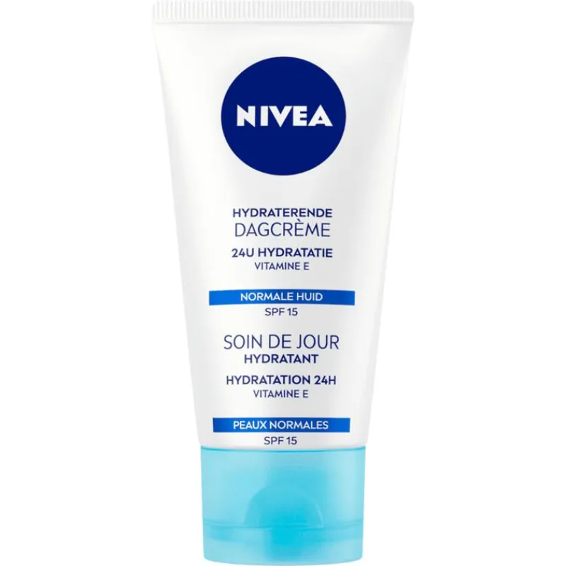 Bescherm en voed je huid dagelijks met NIVEA Hydraterende Dagcrème. Deze hydraterende crème is ontwikkeld voor de normale huid en helpt je huid om in evenwicht te komen. Geniet 24 uur lang van intensieve hydratatie en houd je vochtbalans op peil, waardoor je huid voller en steviger aanvoelt. Tegelijkertijd heeft de dagcrème een verfrissende werking. De toevoeging van SPF 15 zorgt voor dagelijkse bescherming tegen de zon. Zie en voel het verschil: de lichtgewicht crème smelt moeiteloos in de huid. Je huid is elke dag diep gehydrateerd, zacht en veerkrachtig. Dermatologisch goedgekeurd.De NIVEA Essentials Hydraterende Dagcrème put zijn kracht uit het NIVEA Moisture Care Complex, verrijkt met lotusextract voor intensieve hydratatie en versteviging. De toegevoegde vitamine E fungeert als een natuurlijke antioxidant, terwijl magnoliaextract de huid kalmeert en pigmentvlekken tegengaat. Dagelijks gebruik van deze crème zorgt voor een frisse, sterke huid en een stralende teint. • Verrijkt met lotusextract, magnoliaextract en vitamine E• Hydrateert de huid 24 uur lang• Beschermt tegen de zon dankzij SPF 15• Geschikt voor de normale huid• Laat de huid zachter, voller en veerkrachtiger aanvoelen