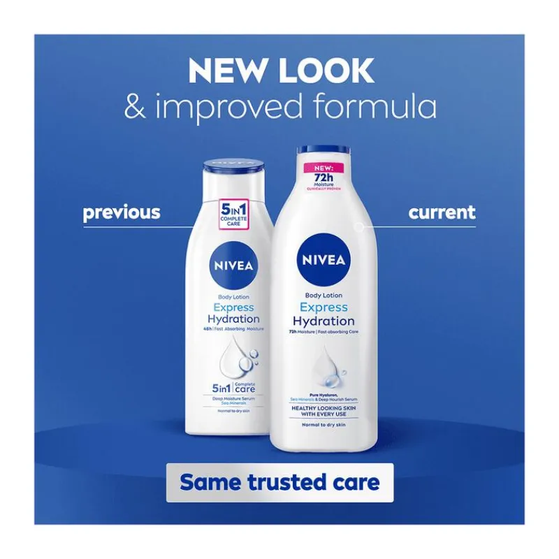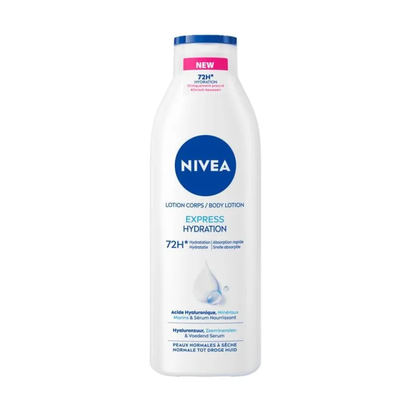 De nieuwe, verbeterde formule van de NIVEA Express Body Lotion hydrateert de huid voor 72uur* lang (klinisch bewezen) voor een gezond uitziende huid bij elk gebruik. Zeer lichte formule met puur hyaluronzuur, zeemineralen en voendend serum. Deze bodymilk biedt verzorging, is niet vettig en trekt snel in. Perfect voor de normale tot droge huid. Ervaar langdurige verzorging en een huid die soepel aanvoelt, de hele dag door. Geef je huid de aandacht die ze verdient met de NIVEA Express Body Lotion. Ideaal voor dagelijks gebruik om je huid verzorgd te houden. Ontdek het gevoel van een goed gehydrateerde huid.