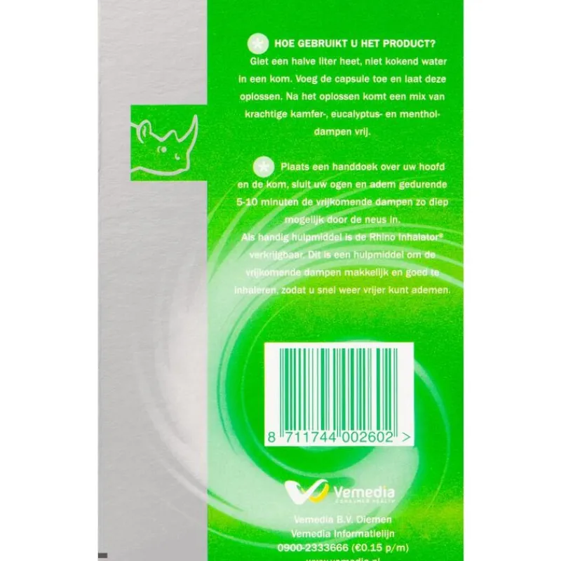 Rhino Caps Inhalatiecapsules helpen om vrijer te ademen bij een verkoudheid. Een stoombad met deze capsules zorgt voor een opgelucht gevoel en geeft verademing.
