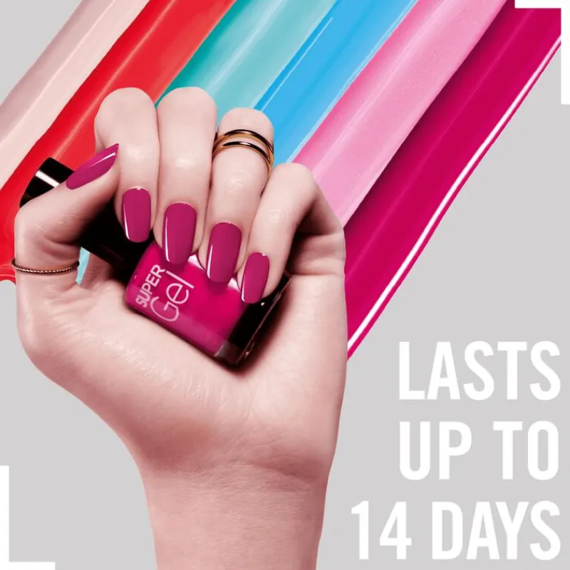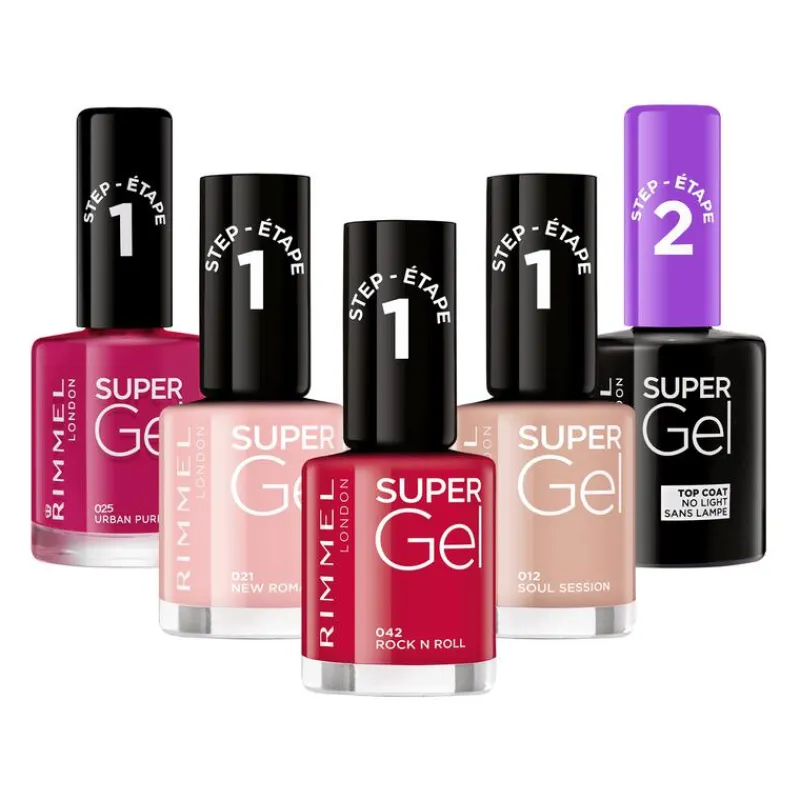Rimmel London introduceert haar nieuwe Super Gel nagellak voor de meest langdurige London look ooit! Lak je nagels met de ongelofelijke kleuren met ingebouwde base coat en lak ze daarna met deze zelf-herstellende topcoat voor de perfecte gel manicure. Zeg JA tegen een verzorgde salon manicure en nee tegen UV lampen, uren in een salon en een lege portemonnee.