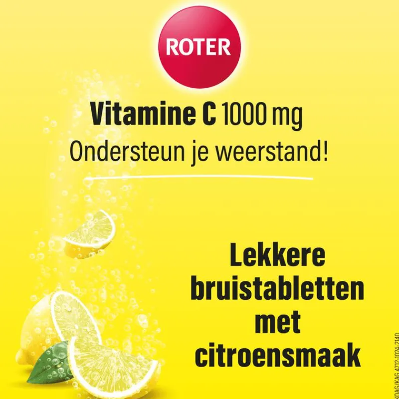 Roter 1000 mg vitamine C Bruis zijn bruistabletten. Het vitamine C bruistablet oplossen in een glas water en direct opdrinken. Aanbevolen dosering is 1 bruistablet per dag. Houd je aan de aanbevolen dosering. Voedingssupplementen in de vorm van extra vitamine C zijn geen vervanging van je dagelijkse voeding.