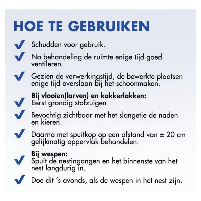 Gebruiksaanwijzing: De spuitbus is op twee manieren te gebruiken: met een slangetje voor doelgerichte bestrijding of met de spuitdop voor grotere oppervlaktes. Bij vlooien(larven) en kakkerlakken: eerst de te behandelen plek grondig stofzuigen. Richt het slangetje op de te behandelen plaatsen (tussen naden en kieren) en breng een hoeveelheid aan tot deze plaatsen zichtbaar vochtig zijn. Spuit daarna op een afstand van ± 20 cm zonder slangetje gelijkmatig met een zwaaiende beweging over het te behandelen oppervlak. Bij wespen: spuit vooral de nestingangen en het binnenste van het nest langdurig in. Het beste is dit ‘s avonds te doen, als de wespen zich in het nest bevinden. Samenstelling: De werkzame stoffen zijn permethrin en tetramethrin.