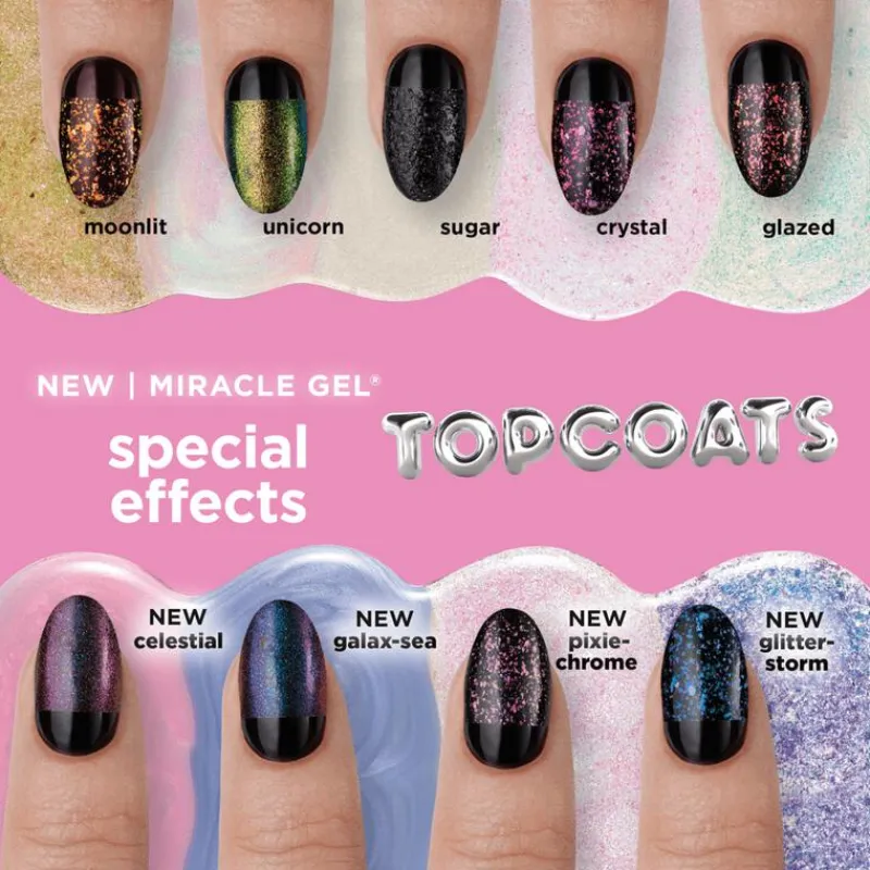 Ontdek 4 Sally Hansen Miracle Gel nagellak toplaagjes met speciale kleureffecten voor de ultieme manicure! Verfraai je lievelingsnagellak met een toplaagje met speciaal kleureffect Mix & match voor een manicure op maat.