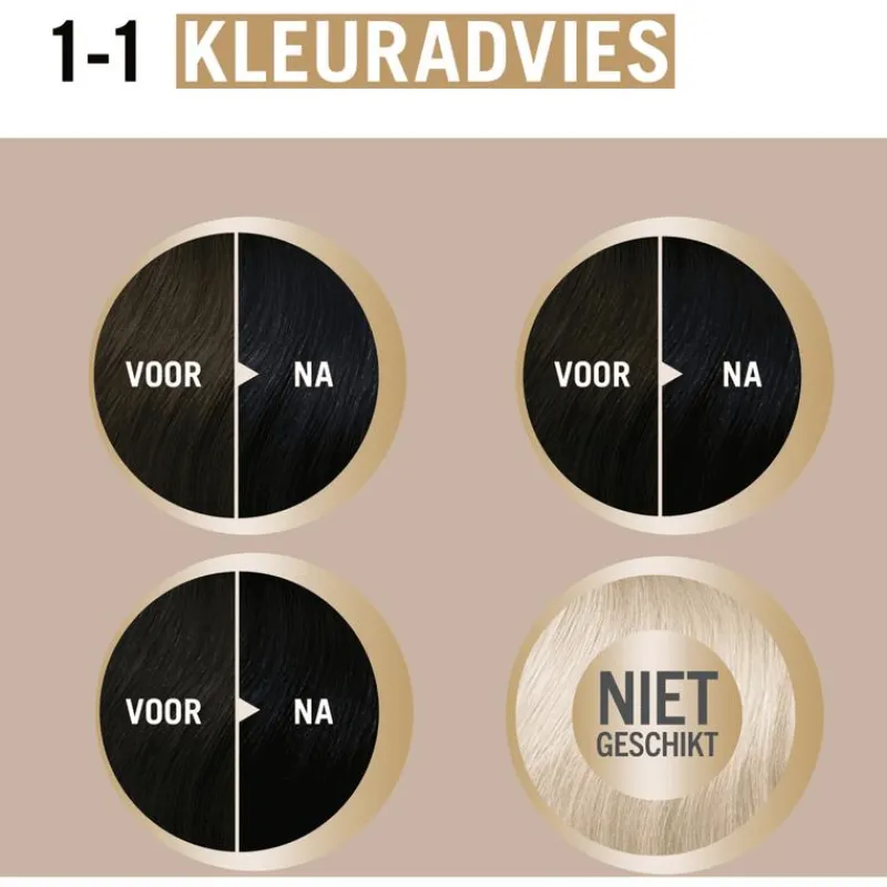 Volg de instructies van de gebruiksaanwijzing. Voer altijd een allergiewaarschuwingstest uit 48u voor het kleuren. Indien u twijfelt tussen twee kleuren, kies u best voor de lichtste kleur. Het kleurresultaat hangt af van uw natuurlijke haarkleur. Voor haar dat langer is dan kinlengte gebruikt u best twee verpakkingen.