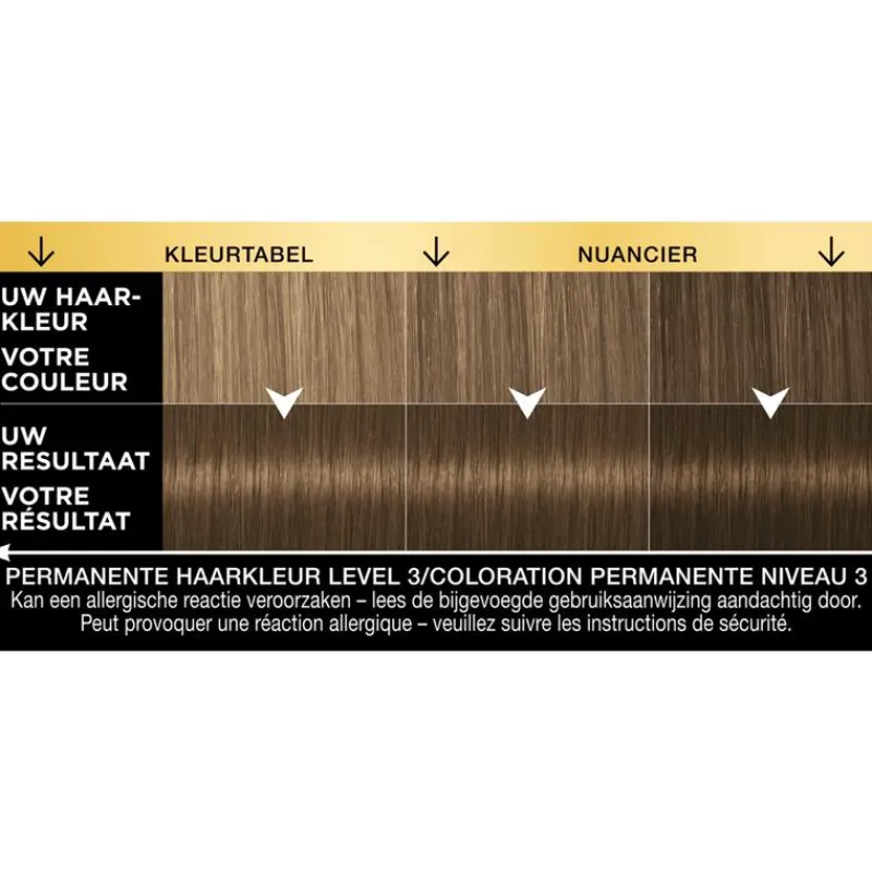 Hair Color/Toner, oxidative dyes:Aqua (Water, Eau)*Cetearyl Alcohol*Ethanolamine*Coconut Alcohol*Sodium Laureth-6 Carboxylate*Sodium Myreth Sulfate*Glycine*Bis-Diisopropanolamino-PG-Propyl Dimethicone/Bis-Isobutyl PEG-14 Copolymer*Acrylamidopropyltrimonium Chloride/Acrylates Copolymer*Coco-Glucoside*Paraffinum Liquidum (Mineral Oil, Huile Minérale)*Glyceryl Oleate*Ceteareth-12*Ceteareth-20*Parfum (Fragrance)*Potassium Hydroxide*Sodium Sulfite*Toluene-2,5-Diamine Sulfate*Sodium Silicate*Etidronic Acid*Ascorbic Acid*Sodium Chloride*Resorcinol*Butyloctanol*Citric Acid*Polysorbate 20*4-Chlororesorcinol*Phenoxyethanol*2-Methylresorcinol*Citronellol*Lactic Acid*Benzyl Alcohol*Alpha-Isomethyl Ionone*2,7-Naphthalenediol*m-Aminophenol*Sodium Benzoate*Methylparaben*Ethylparaben*2,4-Diaminophenoxyethanol HCl|Developer:Aqua (Water, Eau)*Paraffinum Liquidum (Mineral Oil, Huile Minérale)*Hydrogen Peroxide*Cetearyl Alcohol*PEG-40 Castor Oil*Sodium Cetearyl Sulfate*Etidronic Acid*Potassium Hydroxide*2,6-Dicarboxypyridine*Disodium Pyrophosphate*Sodium Benzoate*Sodium Sulfate|:Aqua (Water, Eau)*Cetearyl Alcohol*Quaternium-87*Propylene Glycol*Prunus Armeniaca (Apricot) Kernel Oil*Argania Spinosa Kernel Oil*Panthenol*Isopropyl Myristate*Distearoylethyl Hydroxyethylmonium Methosulfate*Citric Acid*Phenoxyethanol*Stearamidopropyl Dimethylamine*Polyquaternium-37*Ceteareth-20*Glyceryl Stearate*Sodium Methylparaben*Dicaprylyl Carbonate*Parfum (Fragrance)*Hexyl Cinnamal*Benzyl Salicylate*Linalool*Lauryl Glucoside*Benzyl Alcohol*Limonene