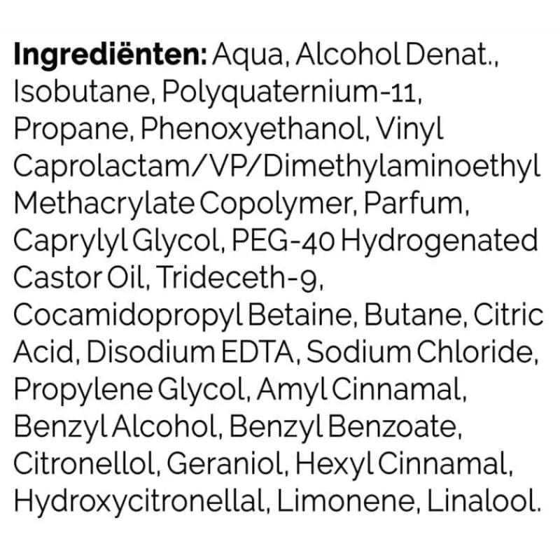 Aqua, Alcohol Denat., Isobutane, Polyquaternium-11, Propane, Phenoxyethanol, Vinyl Caprolactam/VP/Dimethylaminoethyl Methacrylate Copolymer, Parfum, Caprylyl Glycol, PEG-40 Hydrogenated Castor Oil, Trideceth-9, Cocamidopropyl Betaine, Butane, Citric Acid, Disodium EDTA, Sodium Chloride, Propylene Glycol, Amyl Cinnamal, Benzyl Alcohol, Benzyl Benzoate, Citronellol, Geraniol, Hexyl Cinnamal, Hydroxycitronellal, Limonene, Linalool.