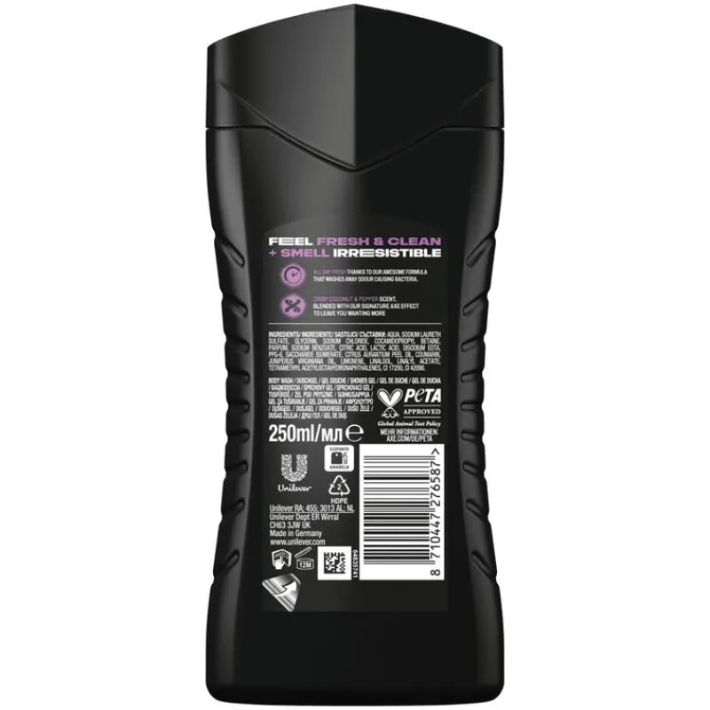 AXE-douchegel is eenvoudig in gebruik. Doe onder de douche een beetje douchegel op de palm van je hand. Wrijf de gel vervolgens tussen je handen, totdat deze gaat schuimen en was jezelf verfrissend schoon. Spoel af en ruik de hele dag onweerstaanbaar.