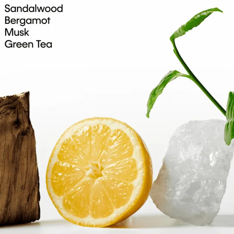 Topnoten van sprankelende Italiaanse bergamot en bloedsinaasappel voegen een levendige intensiteit toe aan de geur. Biologische groene thee-akkoorden worden ondergedompeld in warme basisnoten van sandelhout en upcycled muskus. De geur is clean en sensueel.
