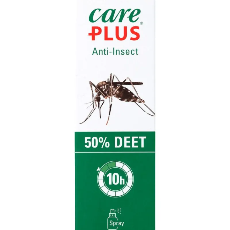 Care Plus Anti-Insect Deet Spray 50% is een insectwerend middel en draagt bij aan de bescherming van gemiddeld 10 uur tegen steken van huismuggen en Anopheles muggen, negen uur tegen steken van Aedes muggen en vijf uur tegen beten van teken. De spray bevat deet en de bittere en de reukloze stof Bitrex om de kans op doorslikken te voorkomen. Care Plus Anti-Insect Deet Spray 50% is geschikt vanaf 18 jaar en is geschikt voor alle bestemmingen.