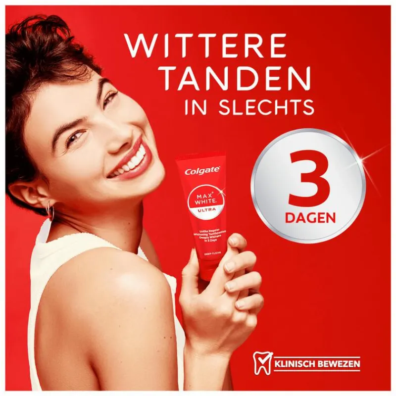 Het is klinisch bewezen dat je met de Colgate Max White Ultra Deep Clean Whitening Tandpasta met actief schuim, met revolutionaire actieve zuurstofhoudende werking, in 3 dagen* wittere tanden krijgt! *Vlekken veroorzaakt door eten en drinken.