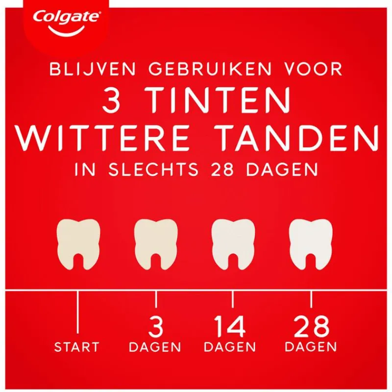 Ervaar de wetenschap van een stralend gebit die garant staat voor wittere tanden in slechts 3 dagen door te poetsen met Colgate Max White Ultra Deep Clean Whitening Tandpasta met actief schuim. Deze whitening tandpasta is veilig voor het glazuur, ook bij dagelijks gebruik, en maakt diepliggende vlekken witter zonder schurende werking. In tegenstelling tot andere whitening tandpasta’s die alleen oppervlakkige vlekken verwijderen, werkt de revolutionaire actieve zuurstofhoudende werking van Colgate op een andere manier. Vanaf de eerste poetsbeurt komen er miljoenen actieve zuurstofmoleculen vrij die veilig onder het glazuuroppervlak doordringen om diepliggende vlekken veroorzaakt door eten en drinken, te verwijderen. De whitening tandpasta verwijdert ook oppervlakkige vlekken en voorkomt toekomstige vlekken. Schenk jezelf een glimlach die net zo stralend is als jij zelf met deze klinisch bewezen whitening tandpasta.