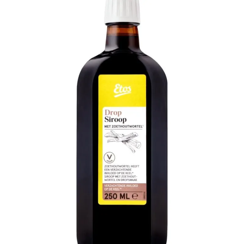 Etos siroop met zoethoutwortel en dropsmaak. Zoethoutwortel heeft een verzachtende invloed op de keel*. Het product is een voedingssupplement.