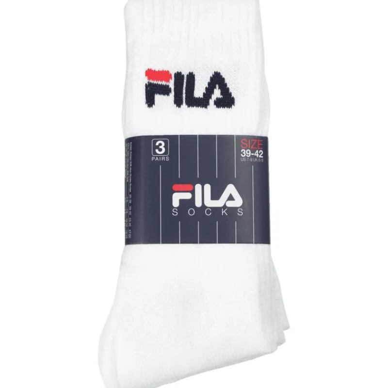 Multipack met 3 paar witte unisex sokken van Fila in de maat 39/42. De sokken hebben een Fila opdruk en zijn gemaakt van 70% katoen/29% polyester/1% elastaan.