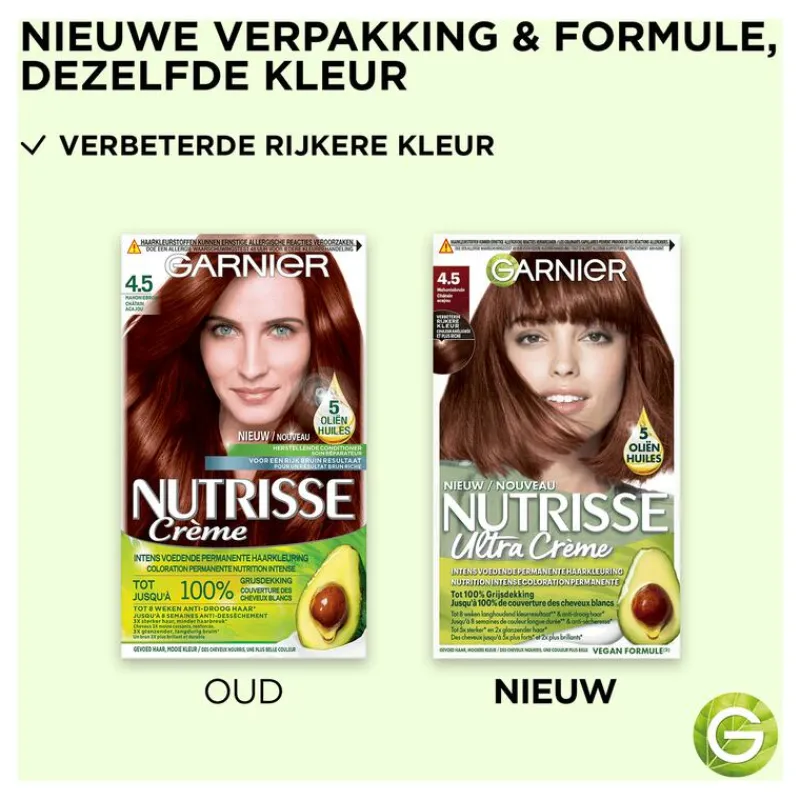 Garnier Nutrisse Ultra Crème is een intens voedende, permanente haarverf die tot 100% grijsdekking biedt. De formule van Nutrisse Ultra Crème geeft een verbeterde, rijkere kleur met behulp van de color boost technologie. Tijdens het kleuren voedt Nutrisse Ultra Crème het haar. De nabehandelende conditioner zorgt voor extra voeding na het kleuren. De conditioner is verrijkt met 5 fruitoliën: avocado-olie, olijfolie, kokosnootolie, arganolie en karité-olie. De conditioner herstelt de haarvezel, houdt de kleur vast en beschermt tegen droogheid. Het haar wordt glanzender en tot 5x sterker*. *Instrumentele test.