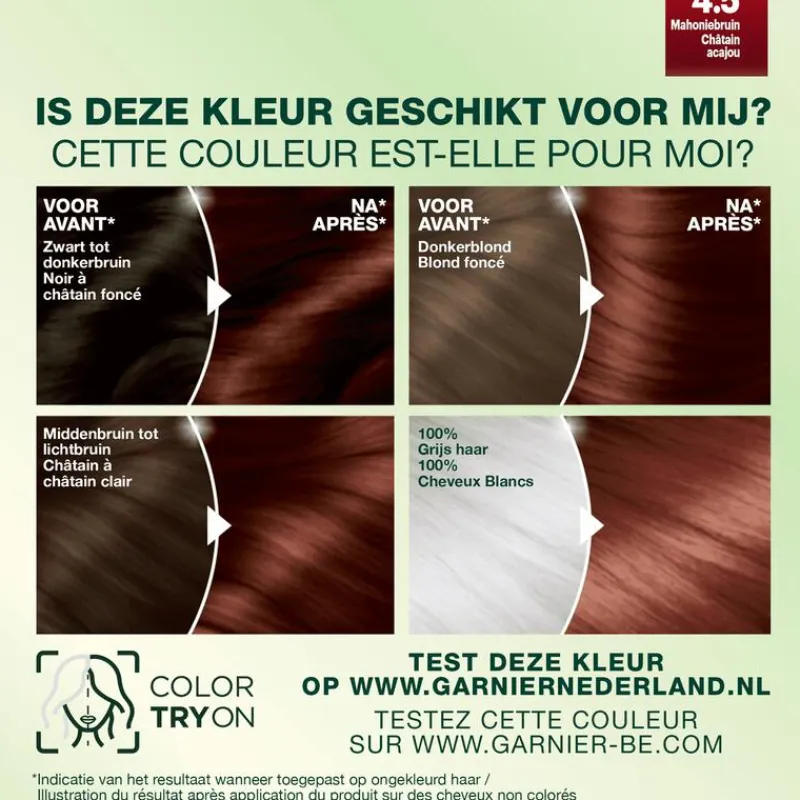 Voorzorgsmaatregelen: Doe een allergie waarschuwingstest 48 uur vóór iedere haarkleurbehandeling ook indien je al eerder een kleurproduct hebt gebruikt. In de gebruiksaanwijzing in de verpakking staat beschreven hoe je dit doet. Volg tijdens het kleuren de gebruiksaanwijzing nauwkeurig op. HOEVEEL VERPAKKINGEN HEB IK NODIG? Heb je kort haar of haar tot op je schouders? Dan is één verpakking voldoende. Bij halflang tot lang haar heb je twee verpakkingen nodig.