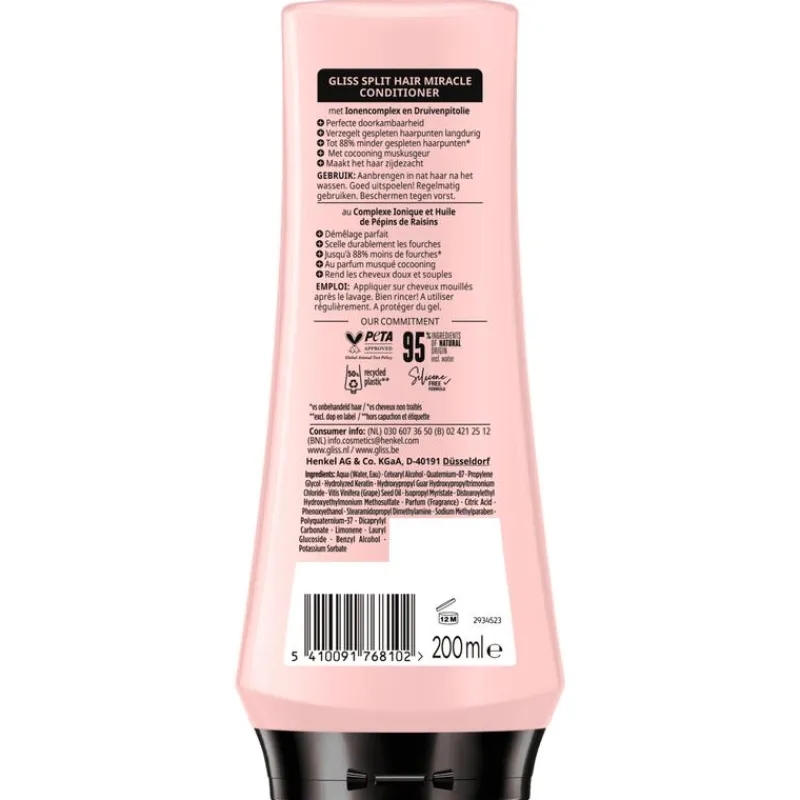 Heb je genoeg van gespleten haarpunten en pluizig haar? Verzegel gespleten haar langdurig! Deze Gliss Split Hair Miracle verzegelende conditioner combineert ionencomplex en druivenpitolie om beschadigde haarvezels en haarbreuk te herstellen. Gliss Care Level: 2 – Medium verzorging, met een uitgebalanceerde samenstelling van voedende ingrediënten. Deze Gliss conditioner werkt als een haarrits, het verzegelt gespleten haar langdurig, voor tot 88% minder gespleten haarpunten (vs. onbehandeld haar). Het geeft het haar perfecte doorkambaarheid. Deze verzegelende conditioner maakt het haar glad en zacht voor een sterk en gezond haargevoel. De verzorgende formule is siliconenvrij. Met cocooning muskusgeur. 95% van de ingrediënten is van natuurlijke oorsprong (inclusief water). Alle Gliss haarverzorgingsproducten zijn vegan (zonder ingrediënten van dierlijke oorsprong).