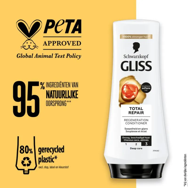 Gliss conditioner biedt diepgaand herstel en vermindert haarbreuk (vs. onbehandeld haar). Het geeft het haar perfecte doorkambaarheid. Deze regenererende conditioner maakt het haar glad en zacht, laat het soepel en gezond glanzen. Met cocooning muskusgeur. 95% van de ingrediënten is van natuurlijke oorsprong (inclusief water). Alle Gliss haarverzorgingsproducten zijn gecertificeerd door PETA.