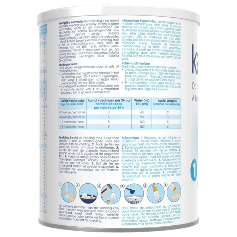 Verpakt onder beschermende atmosfeer.Borstvoeding is de meest geschikte voeding voor je baby. Indien je geen borstvoeding geeft of wilt overstappen op flesvoeding kan Kabrita Zuigelingenmelk (0-6 maanden) gebruikt worden. Kabrita Zuigelingenmelk is geschikt vanaf de geboorte. Gebruik Kabrita Zuigelingenmelk in overleg met je arts of consultatiebureau. Volg altijd de instructies op het blik, tenzij anders voorgeschreven.
