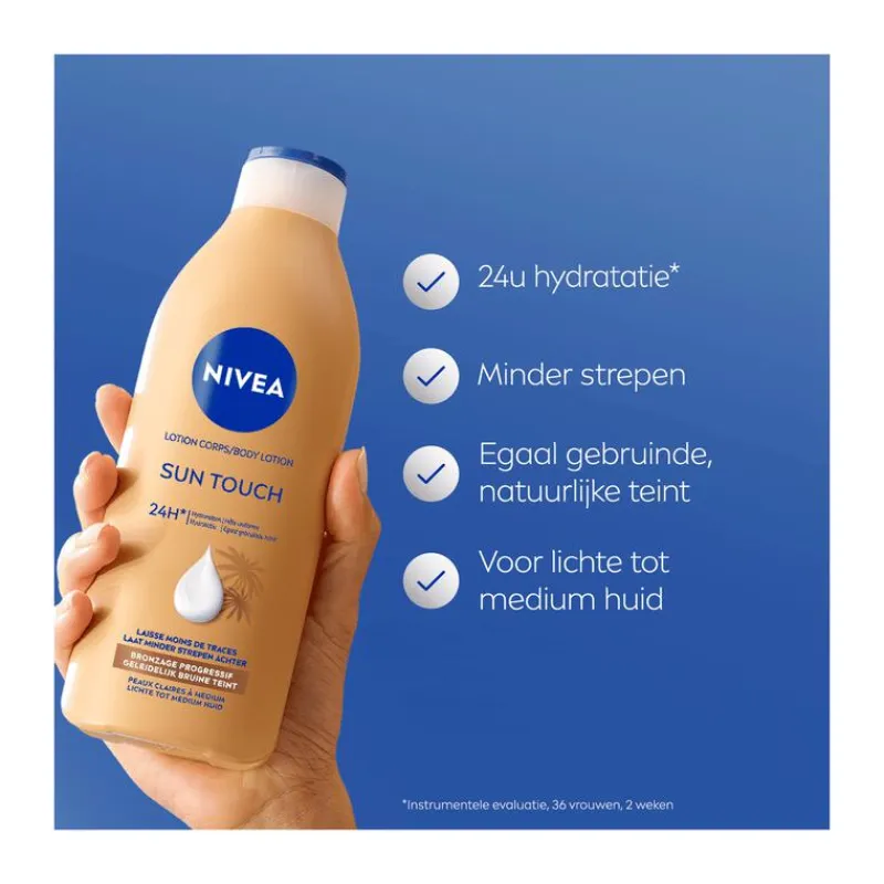 Geef de huid een natuurlijke bruine tint met NIVEA Bronze Effect Bodylotion. Dit is niet alleen een voedende en hydraterende bodylotion, maar ook een effectieve zelfbruiner. Door je huid dagelijks in te smeren met de zelfbruiner bodylotion ontstaat er geleidelijk een gebruind effect. Geniet van een gelijkmatige teint en laat je huid stralen dankzij de verzorgende bestanddelen die tot wel 24 uur lang hydratatie bieden. Je huid voelt heerlijk zacht aan en oogt binnen vijf dagen bruiner.