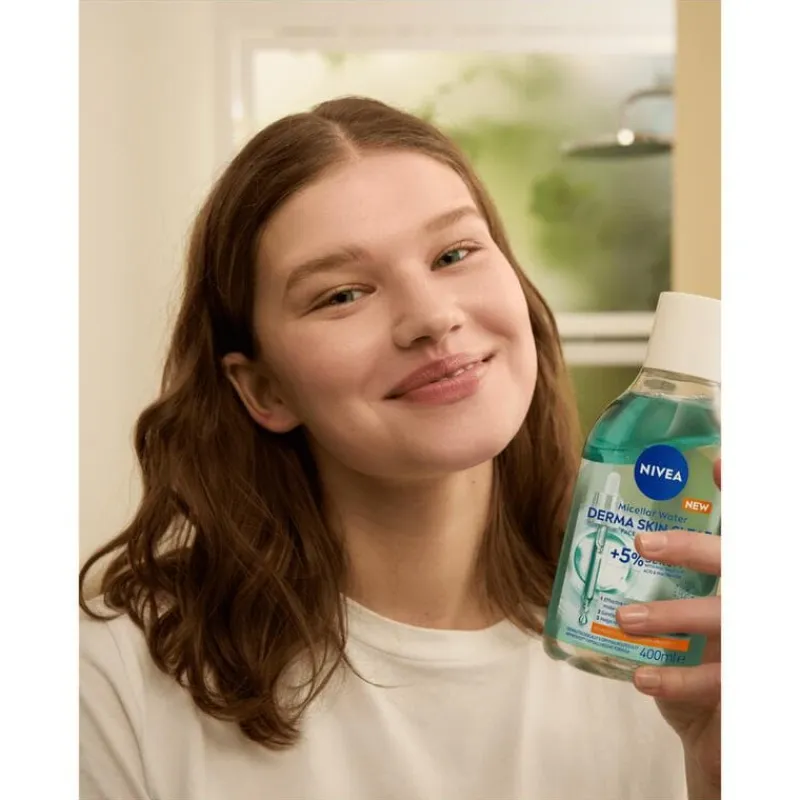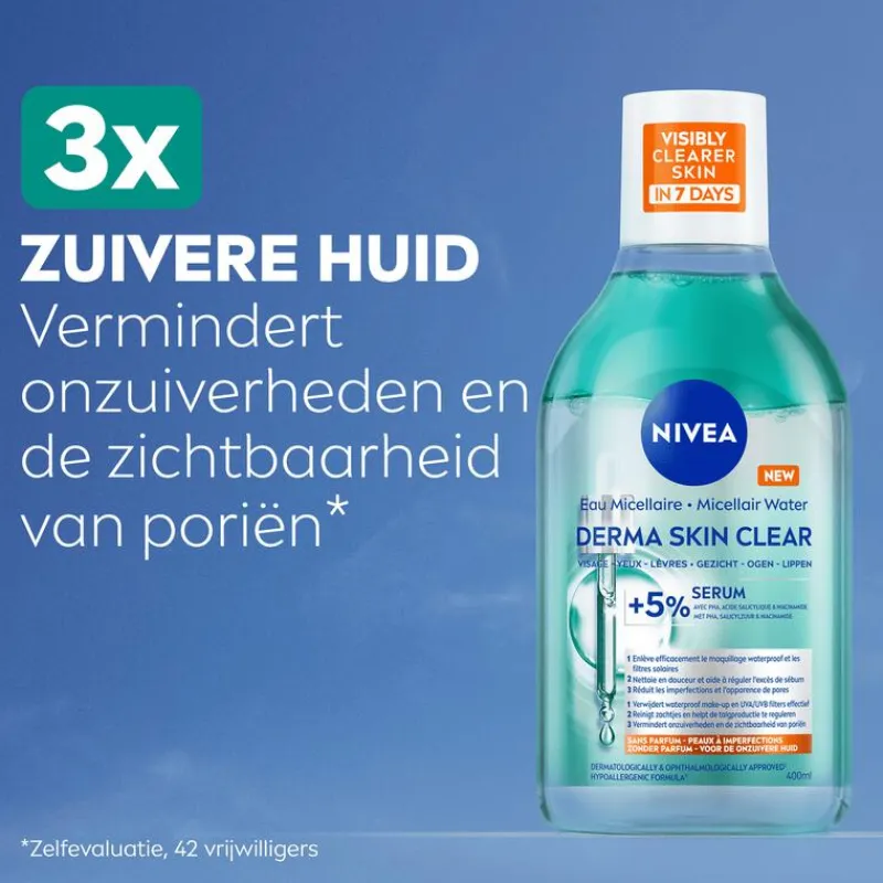 NIVEA Derma Skin Clear Micellair Water 400ml voor de onzuivere huid met 5% Serum met PHA, Salicylzuur & Niacinamide verwijdert waterproof make-up & UVA/UVB filters effectief en zacht en moeiteloos. Het vermindert onzuiverheden, de zichtbaarheid van poriën en reguleert overtollig talg voor een gladde en zuivere gavere huid*. Het is zonder parfum en de huid- en oogverdraagzaamheid is dermatologisch en oftalmologisch getest.