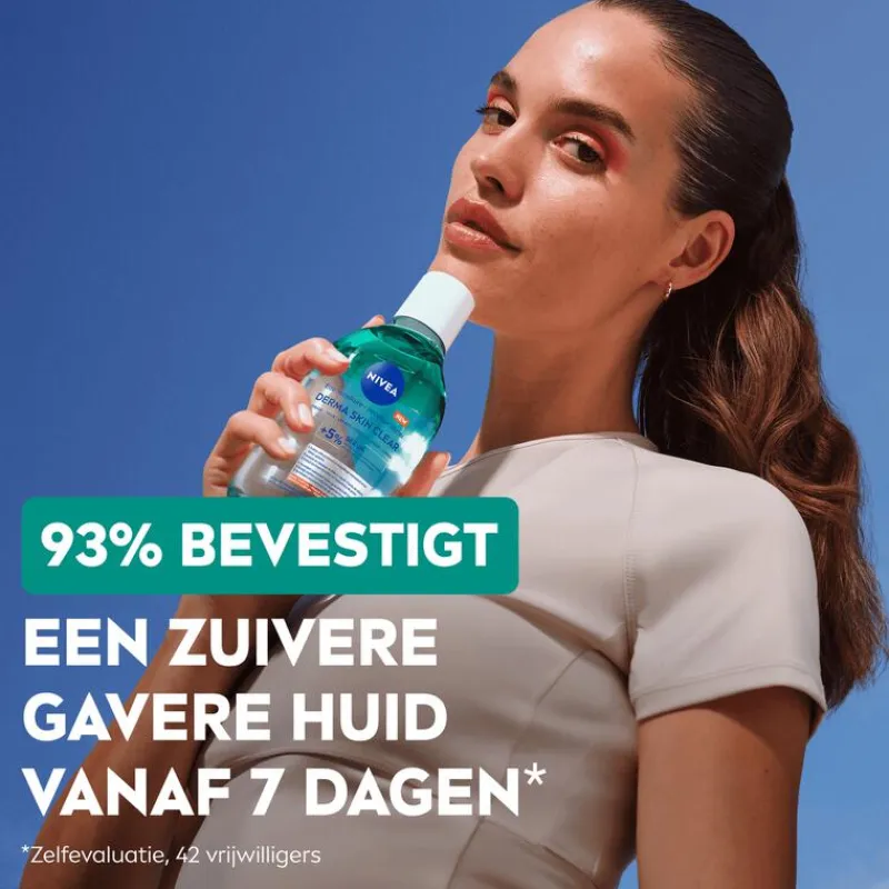 *Een zuivere gavere huid vanaf 7 dagen – zelfevaluatie, 42 vrijwilligers **Huid- en oogverdraagzaamheid dermatologisch en oftalmologisch getest. Micellair Water met 5% SERUM + AMINO ACID COMPLEX Vermindert onzuiverheden en reguleert overtollig talg. Verwijdert make-up, onzuiverheden en UVA/UVB filters zacht en moeiteloos. GEBRUIK: De fles goed schudden vóór gebruik om de 2 fases te mengen. Veeg zachtjes met een wattenschijfje om make-up en mascara te verwijderen. Afspoelen niet nodig. NIVEA zorgt voor je huid en meer Fles gemaakt van 97% gerecycled materiaal – label, insert en dop uitgezonderd **Huid- en oogverdraagzaamheid dermatologisch en oftalmologisch getest.