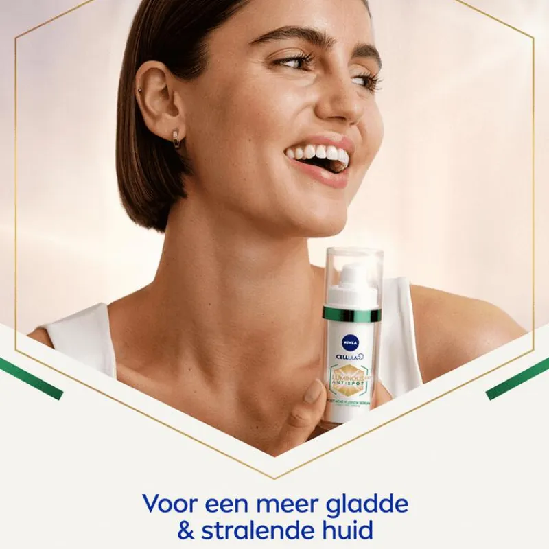Verminder donkere vlekken na acne effectief met het NIVEA CELLular LUMINOUS630 Anti-spot Post-acne vlekken Serum. Dit serum heeft een de gelachtige textuur en vermindert zichtbaar donkere vlekjes na acne binnen twee weken. NIVEA CELLular LUMINOUS630 Anti-spot Post-acne vlekken Serum is speciaal ontwikkeld voor de behoeften van de vette, gemengde en onzuivere huid. De speciale formule werkt drievoudig. Zo vermindert het serum zichtbaar donkere vlekken na acne en maakt het de huid glad. Genit van de matte finish. Kalmeer de vette huid en straal weer dankzij de bestanddelen in het NIVEA CELLular Luminous Post-acne vlekken serum.Het NIVEA Luminous Anti-spot serum bevat LUMINOUS630 voor het verminderen van donkere vlekken na acne, salicylzuur voor exfoliatie, hyaluronzuur voor hydratatie en groene thee-extract om de huid in balans te brengen. Na 2 weken zijn de donkere vlekken zichtbaar lichter*, en na 12 weken meldt 100% van de vrouwen een vermindering van hun donkere vlekken. • Vermindert donkere vlekken na acne• Exfolieert en egaliseert de huid• Heeft een matterende werking• Brengt de huid tot rust• Verrijkt met LUMINOUS630, salicylzuur, hyaluronzuur en groene thee-extract