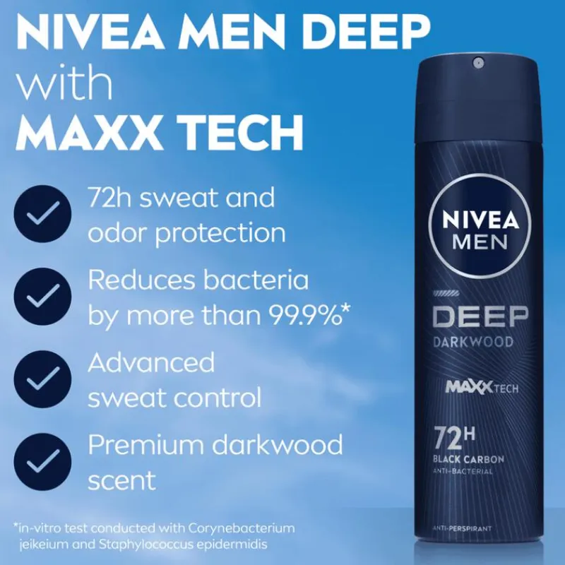 NIVEA MEN DEEP Darkwood Black Carbon Anti-Transpirant is speciaal ontwikkeld voor mannen die op zoek zijn naar een krachtige en betrouwbare bescherming tegen transpiratie. Deze deodorant biedt maar liefst 72 uur lang effectieve anti-transpirantbescherming, waardoor je de hele dag verzekerd bent van een fris en zelfverzekerd gevoel. De unieke formule is verrijkt met zwart koolstof, wat niet alleen zorgt voor een krachtige bescherming tegen bacteriën, maar ook een langdurige, mannelijke geur van donkere houtsoorten biedt.Deze deodorant voor mannen is ontworpen om geen zichtbare zwarte resten achter te laten, zodat je huid droog en schoon aanvoelt zonder ongewenste sporen op je kleding. Of je nu een drukke werkdag hebt, intensief sport of ontspant tijdens je vrije tijd, NIVEA MEN DEEP zorgt ervoor dat je altijd fris en verzorgd blijft. Bovendien is de huidverdraagzaamheid dermatologisch bewezen, zodat je deze deo met een gerust hart dagelijks kunt gebruiken. Kies voor NIVEA MEN DEEP Darkwood Black Carbon Anti-Transpirant en ervaar krachtige bescherming, langdurige frisheid en ultiem comfort in één.