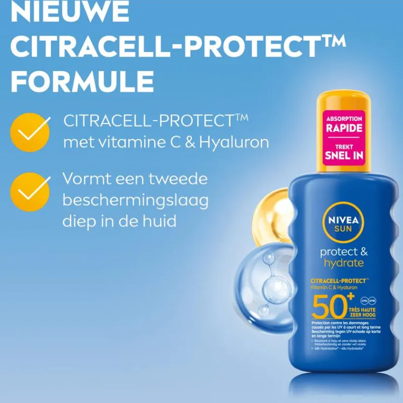 Geef je huid de bescherming die het verdient met de NIVEA SUN Protect & Hydrate Spray SPF50+. Deze zonnespray biedt betrouwbare UVA/UVB-bescherming en beschermt je huid tegen UV-schade op korte en lange termijn. Dankzij de innovatieve CitraCell-ProtectTM-formule met vitamine C en hyaluron wordt een extra beschermingslaag gecreëerd die je huid niet alleen beschermt, maar ook hydrateert. De lichte formule trekt snel in, is eenvoudig aan te brengen en laat geen vettig gevoel of wit residu achter.Met een hydraterende werking die tot 48 uur* aanhoudt, zorgt deze zonnebrand spray ervoor dat je huid zacht en gezond aanvoelt, zelfs tijdens intensieve blootstelling aan de zon. Of je nu op zoek bent naar een effectieve zonnebrandcrème gezicht, een handige zonnebrand spray voor onderweg, of een betrouwbare keuze voor de hele familie, deze zonnespray voldoet aan al je verwachtingen.Perfect te combineren met je favoriete aftersun voor een complete zonverzorgingsroutine. *Instrumentele test, 43 vrijwilligers
