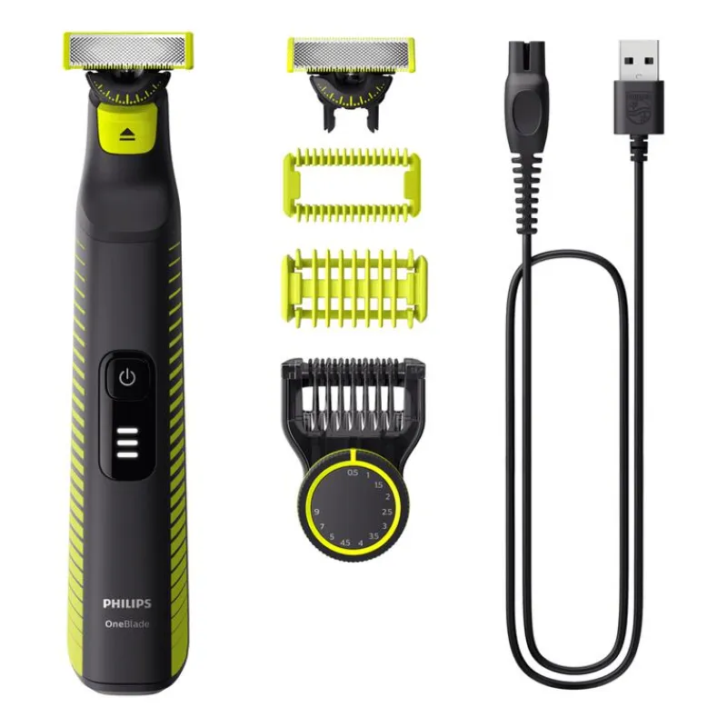 Met de Philips OneBlade Pro 360 Face + Body trim, scheer en style je moeiteloos gezichts- én lichaamshaar van elke lengte. De 360 Blade beweegt in alle richtingen, waardoor je makkelijk de moeilijkste gebieden bereikt, met minder bewegingen*. Trim je baard op een nauwkeurige lengte met de precisietrimkam met 12 lengtestanden, gebruik de lichaamstrimkam (3mm) voor een comfortabele trimbeurt op je lichaam of plaats de huidbeschermingskap op het mesje voor extra bescherming op gevoelige gebieden. Creëer makkelijk en snel jouw eigen stijl met Philips OneBlade Pro 360. Elk mesje gaat tot 4 maanden mee**.