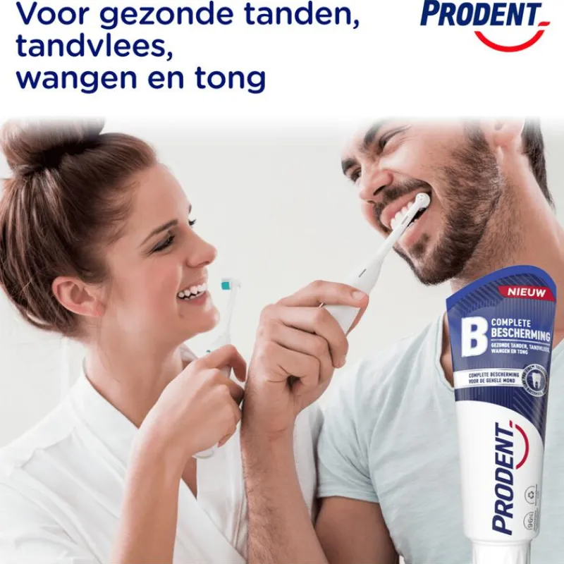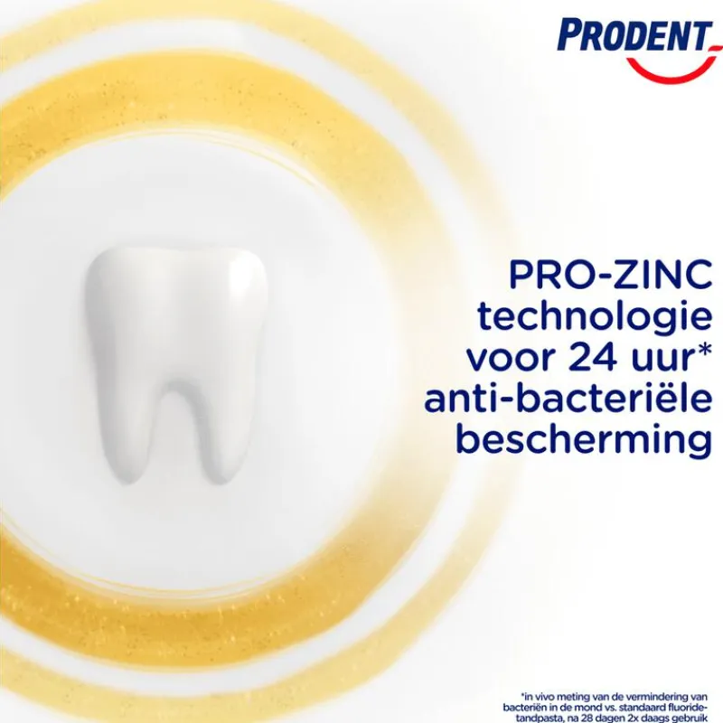 Prodent Complete Bescherming Tandpasta zorgt dat de gehele mond dagelijks beschermd is en gezond blijft. De formule van deze tandpasta met Pro-Zinc Technologie bestrijdt bacteriën niet alleen op de tanden, maar ook op tandvlees, wangen en tong. De Pro-Zinc Technologie heeft namelijk een prebiotisch effect dat de natuurlijke afweer van de mond versterkt door de goede bacteriën te laten toenemen en de slechte te verminderen. Het resultaat is een antibacteriële werking van 24 uur en 3x efficiëntere complete bescherming*, voor gezonde tanden, tandvlees, wangen en tong. De doeltreffende formule is geschikt voor het hele gezin. *In vivo meting van de vermindering van bacteriën op tanden, tandvlees, wangen en tong in vergelijking met een standaard fluoridetandpasta, na 28 dagen tweemaal daags gebruik.